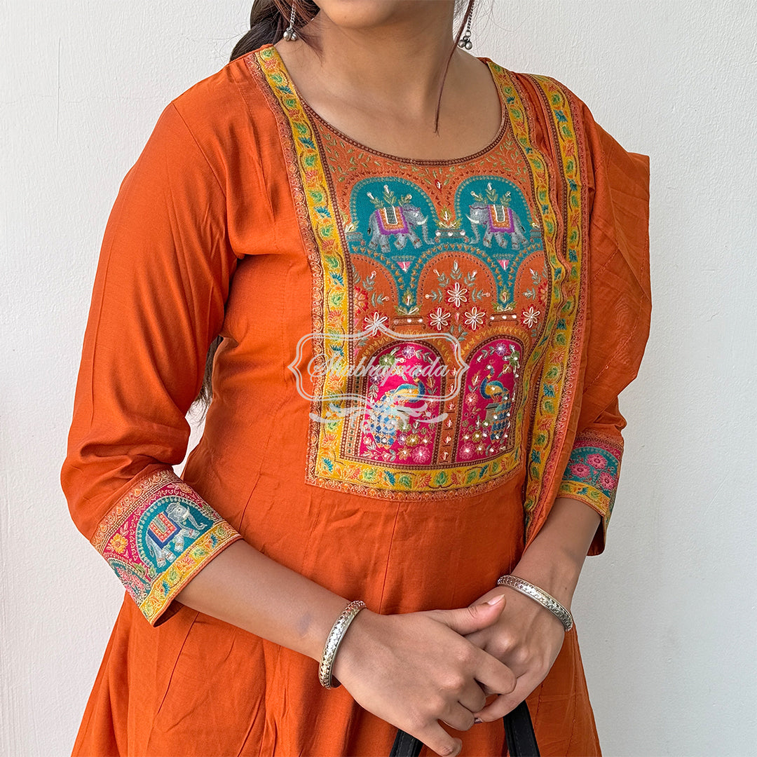 Blaze Orange Hand Embroidered with Sequins Work Muslin Suit Set