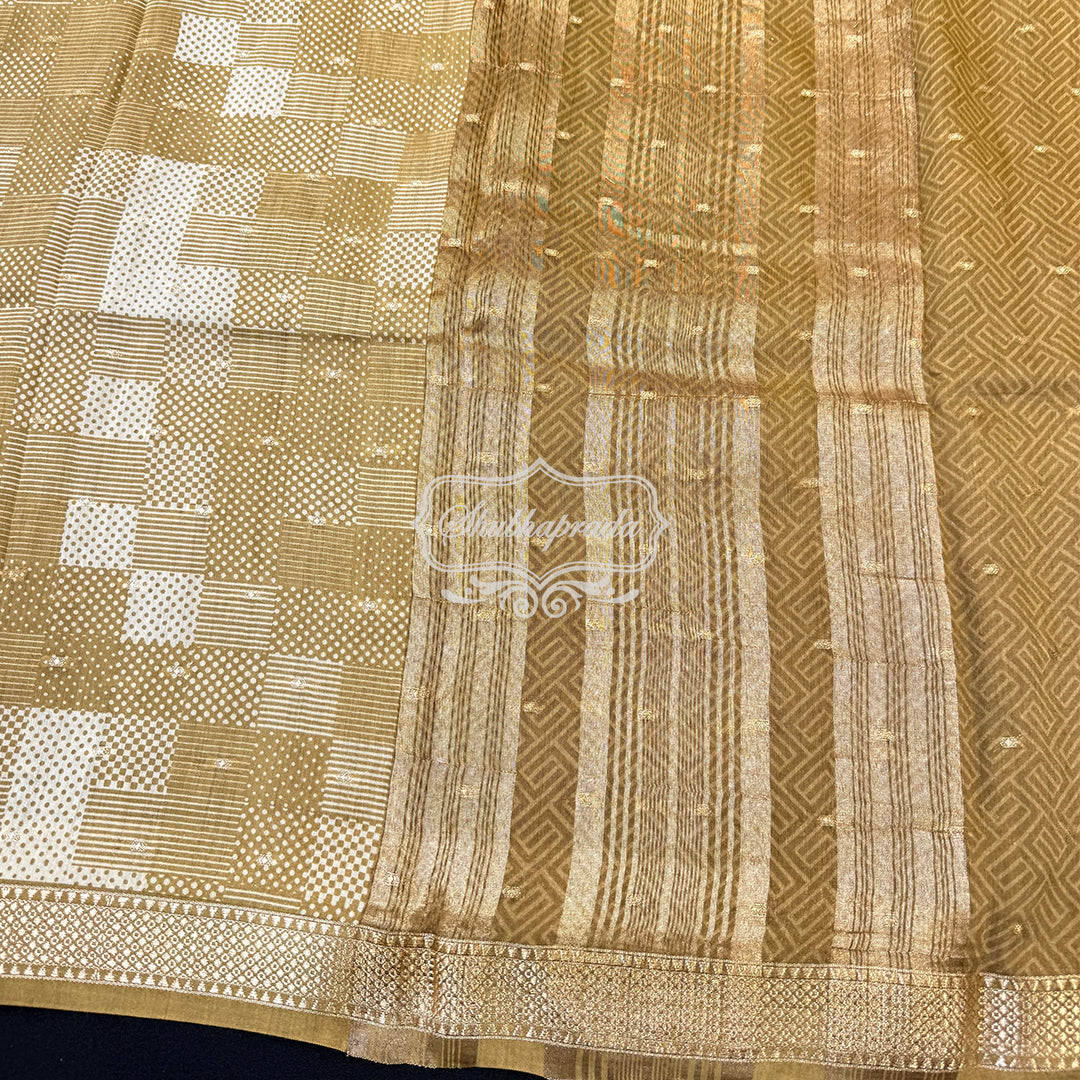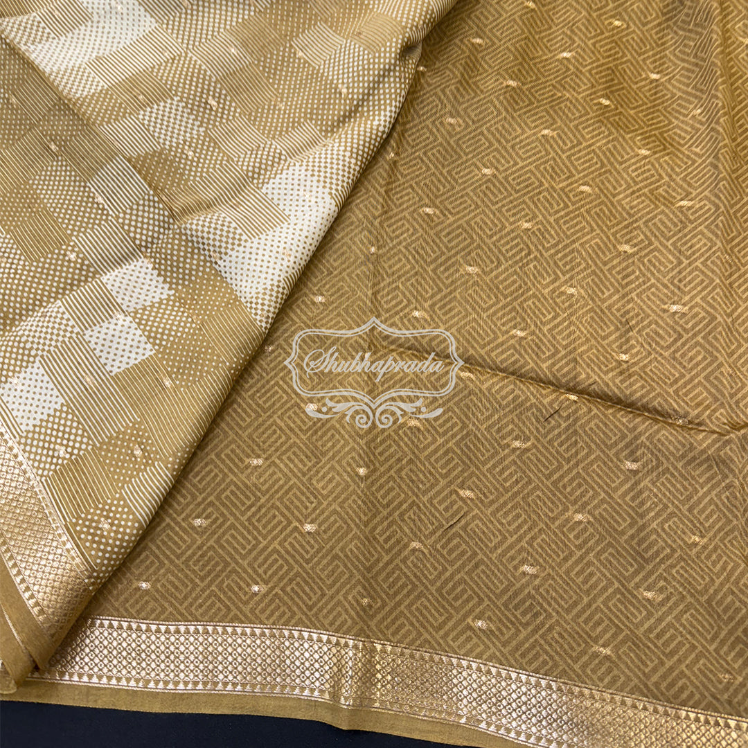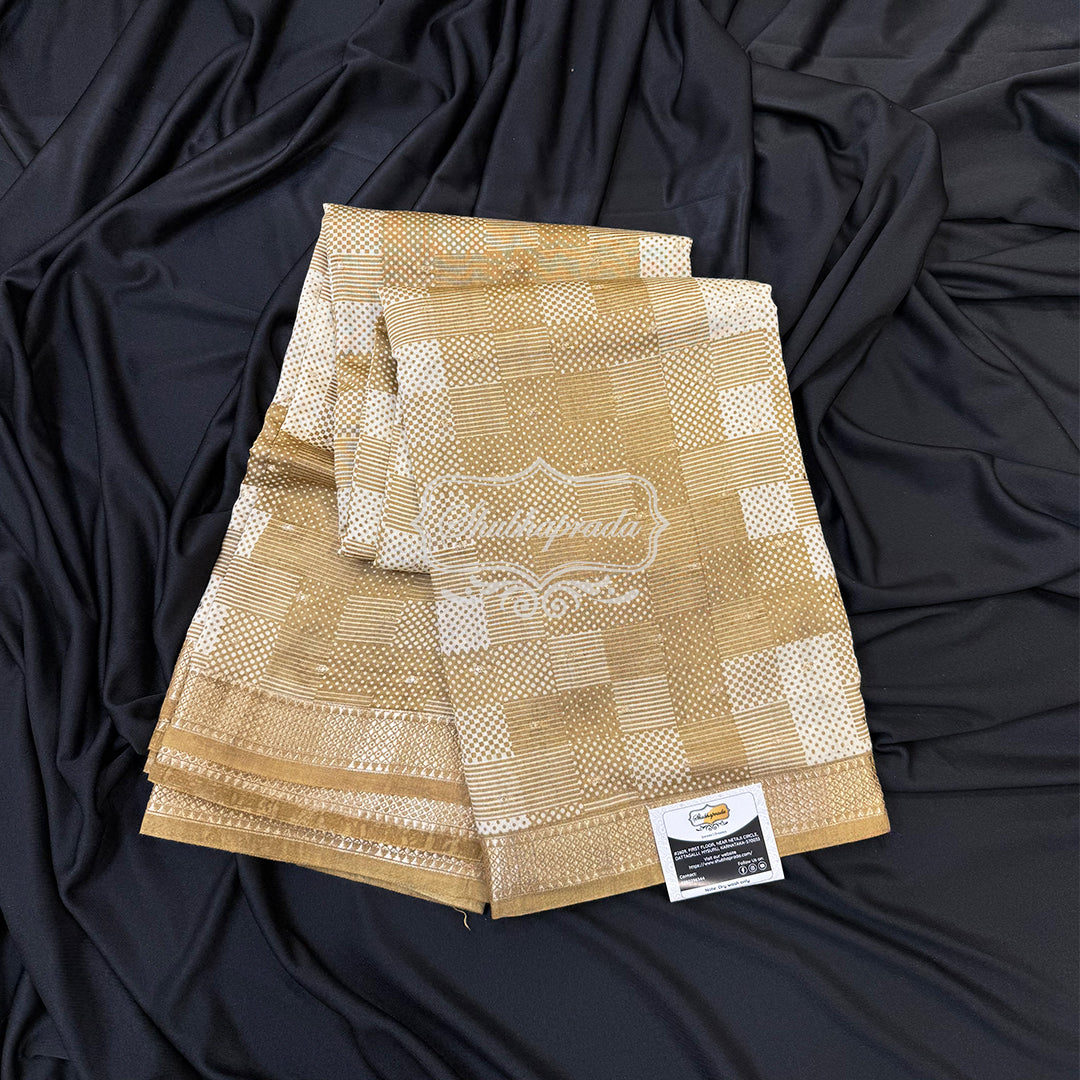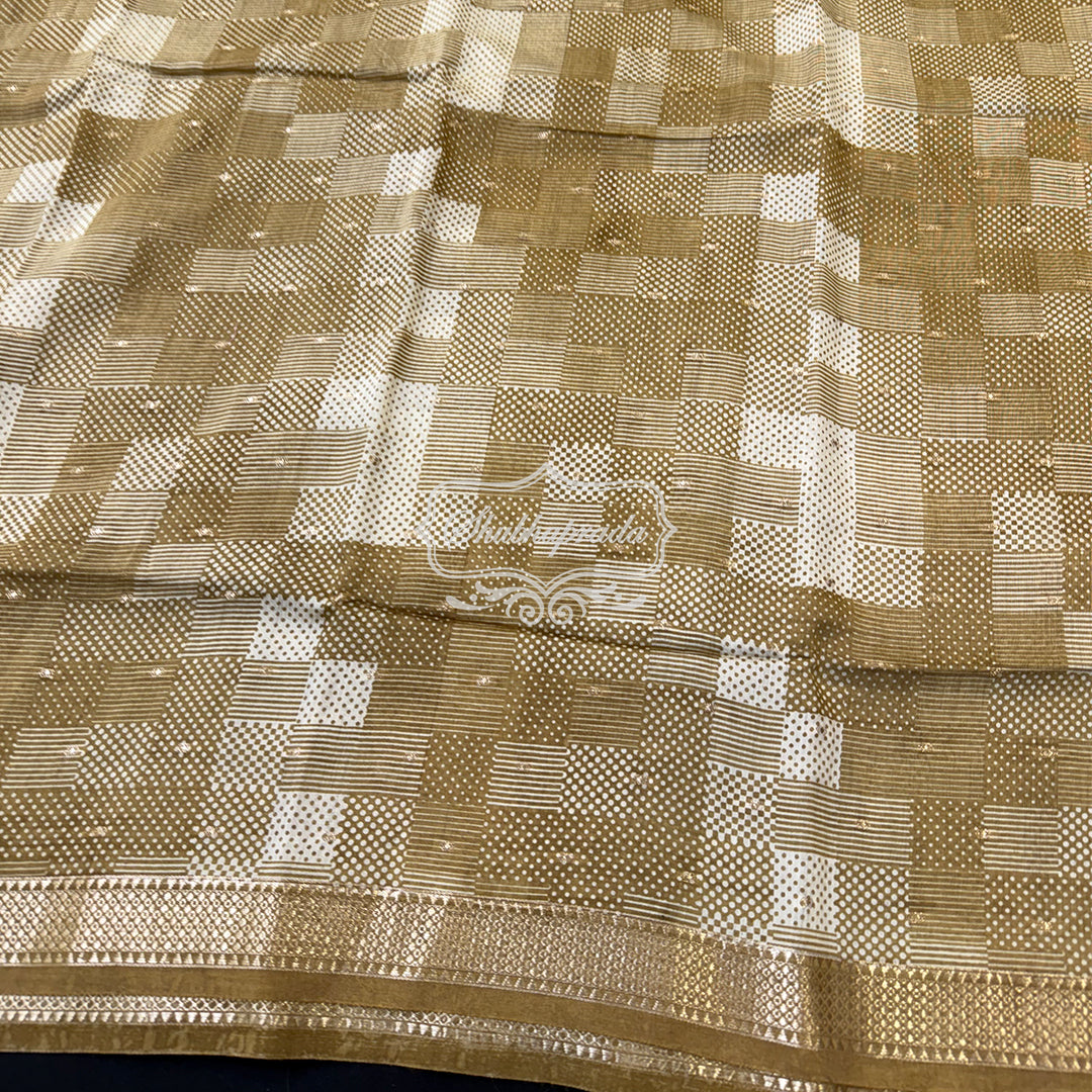 - Work : Digital Checks Print with Golden Butta all over the body and Golden Weave Zari