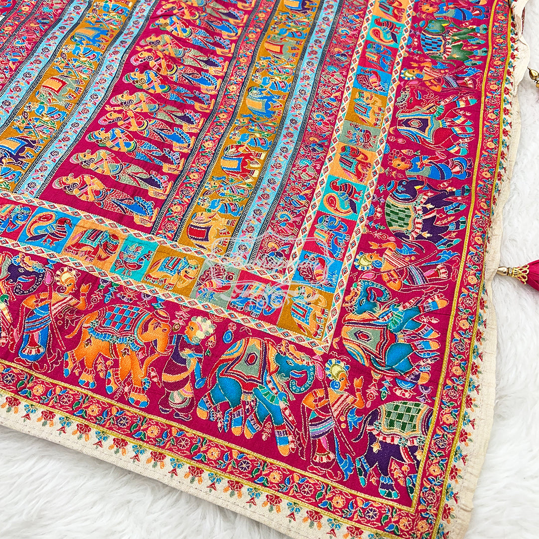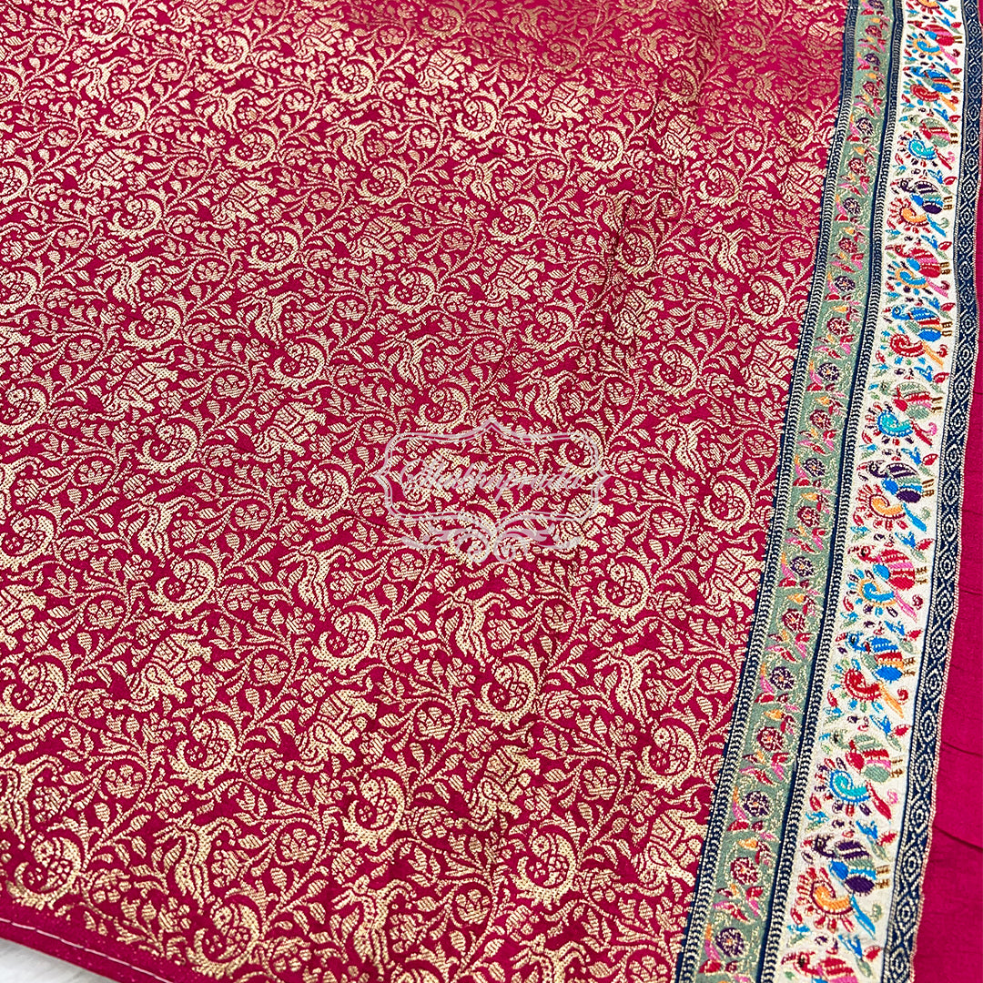 A masterpiece of intricate artistry. This luxurious saree, with its beautiful Pashmina-style thread and zari weaving, offers a stunning blend of pastels and brights. The result is a grand, head-turning look that is sure to leave everyone in awe.