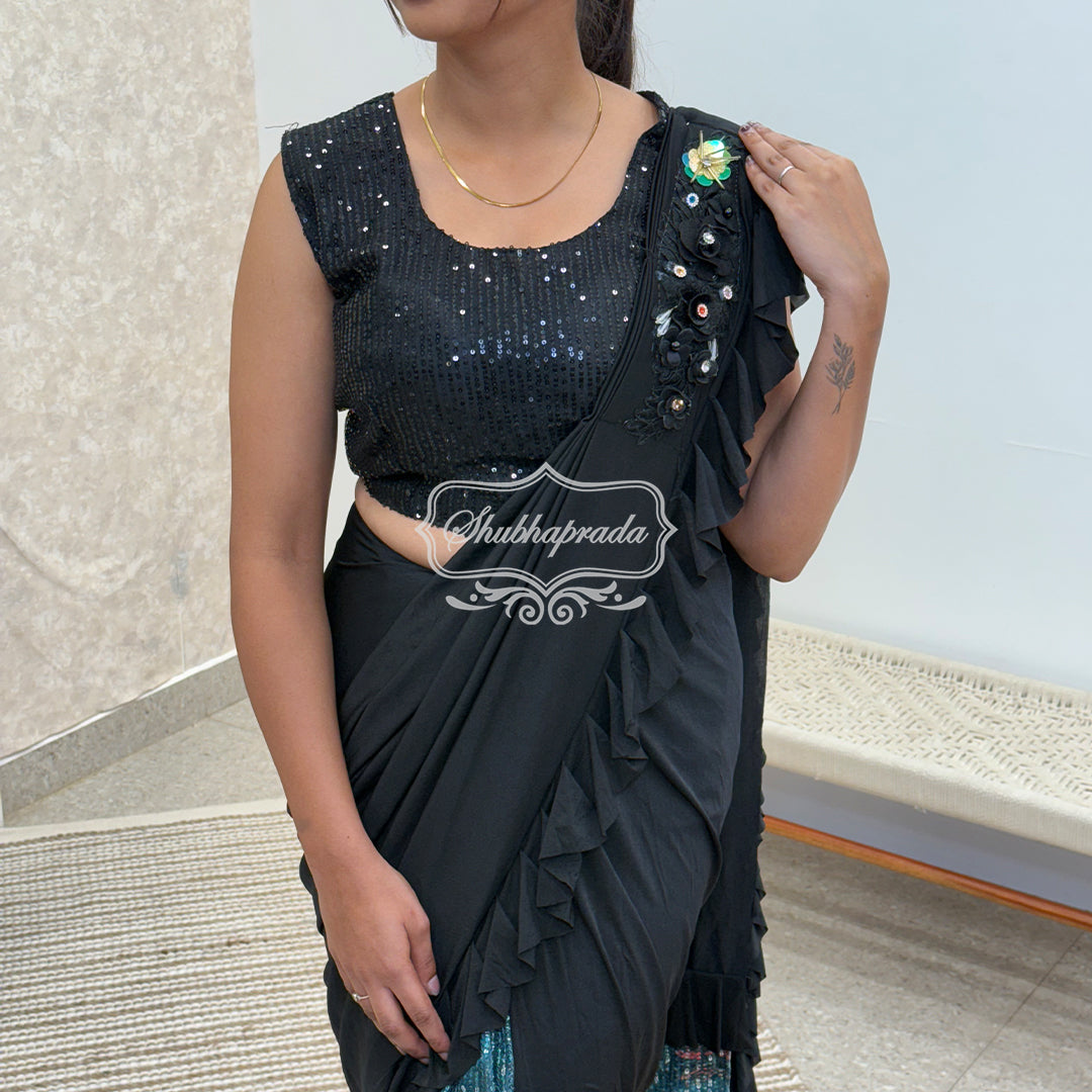 Black & Turquoise Sequins Flared One Minute Ready to Wear Satin Blend Saree