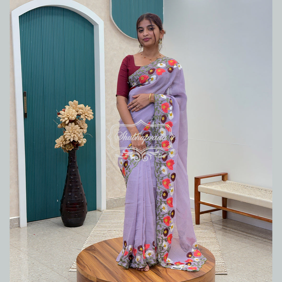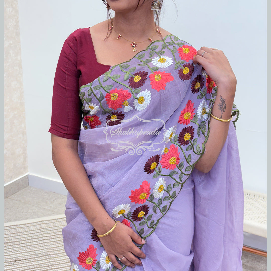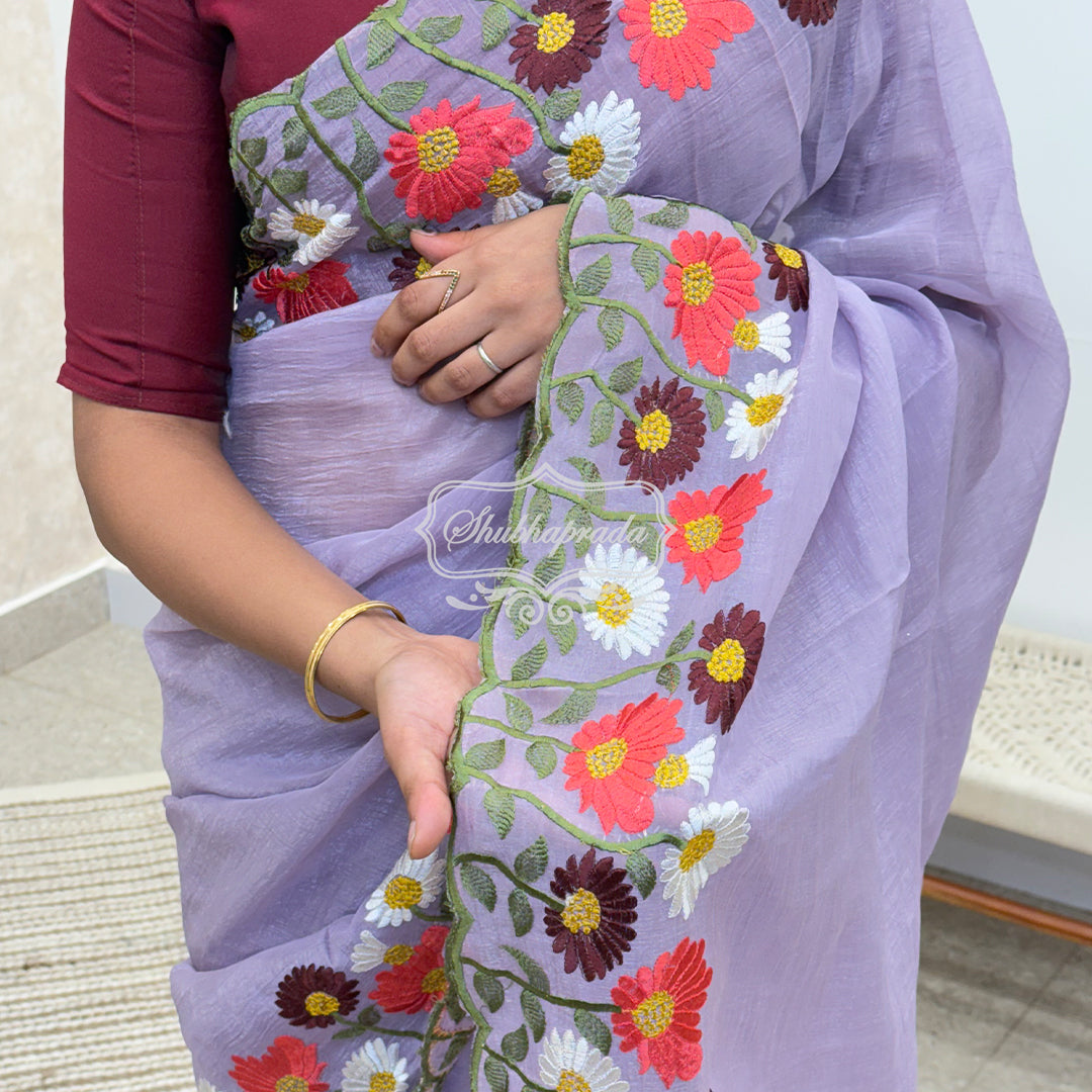 Beautiful Lavender Crush Paper Silk Organza with Floral Embroidery Border Saree
