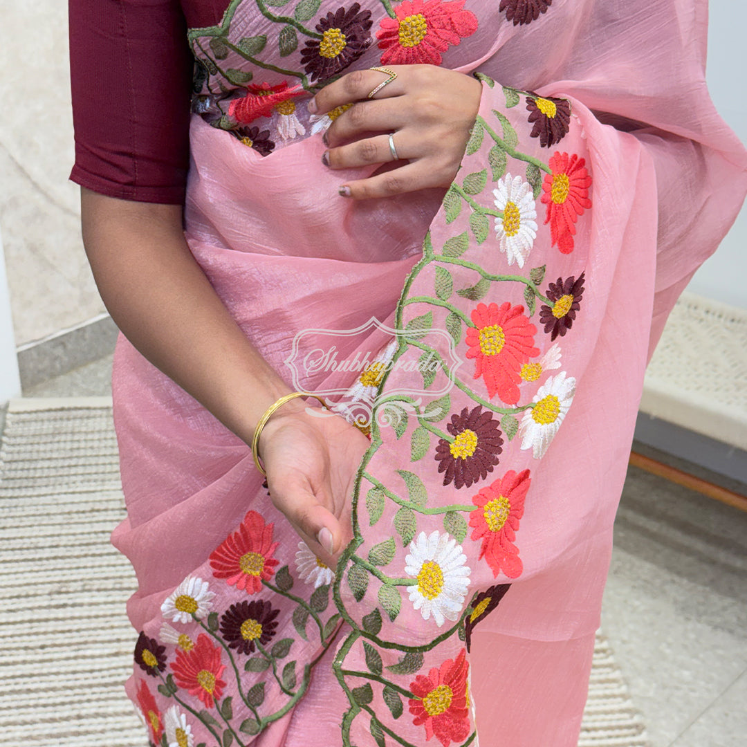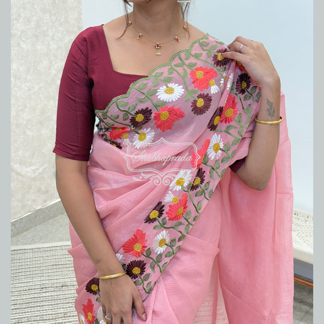 Beautiful Pink Crush Paper Silk Organza with Floral Embroidery Border Saree