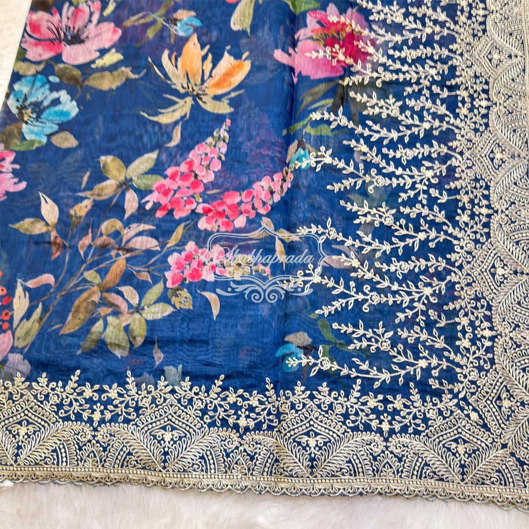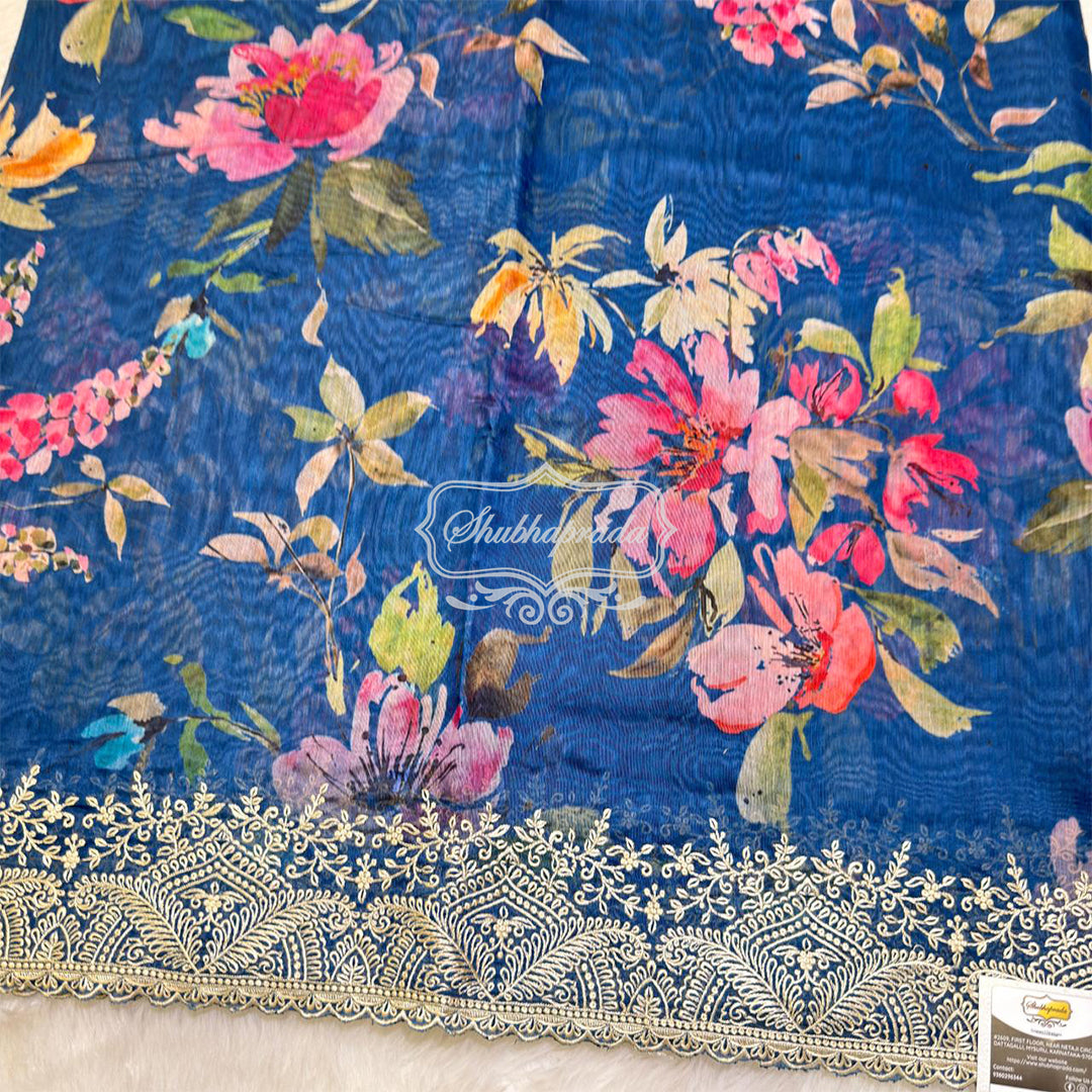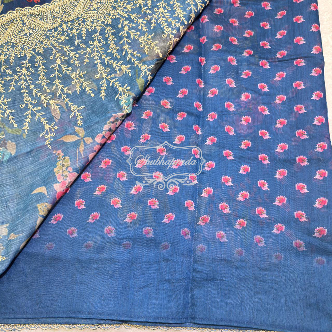 Rama Blue Floral Design Embroidery Border Chanderi Saree