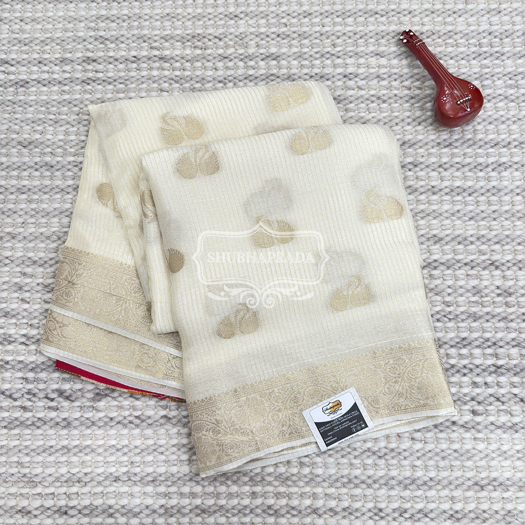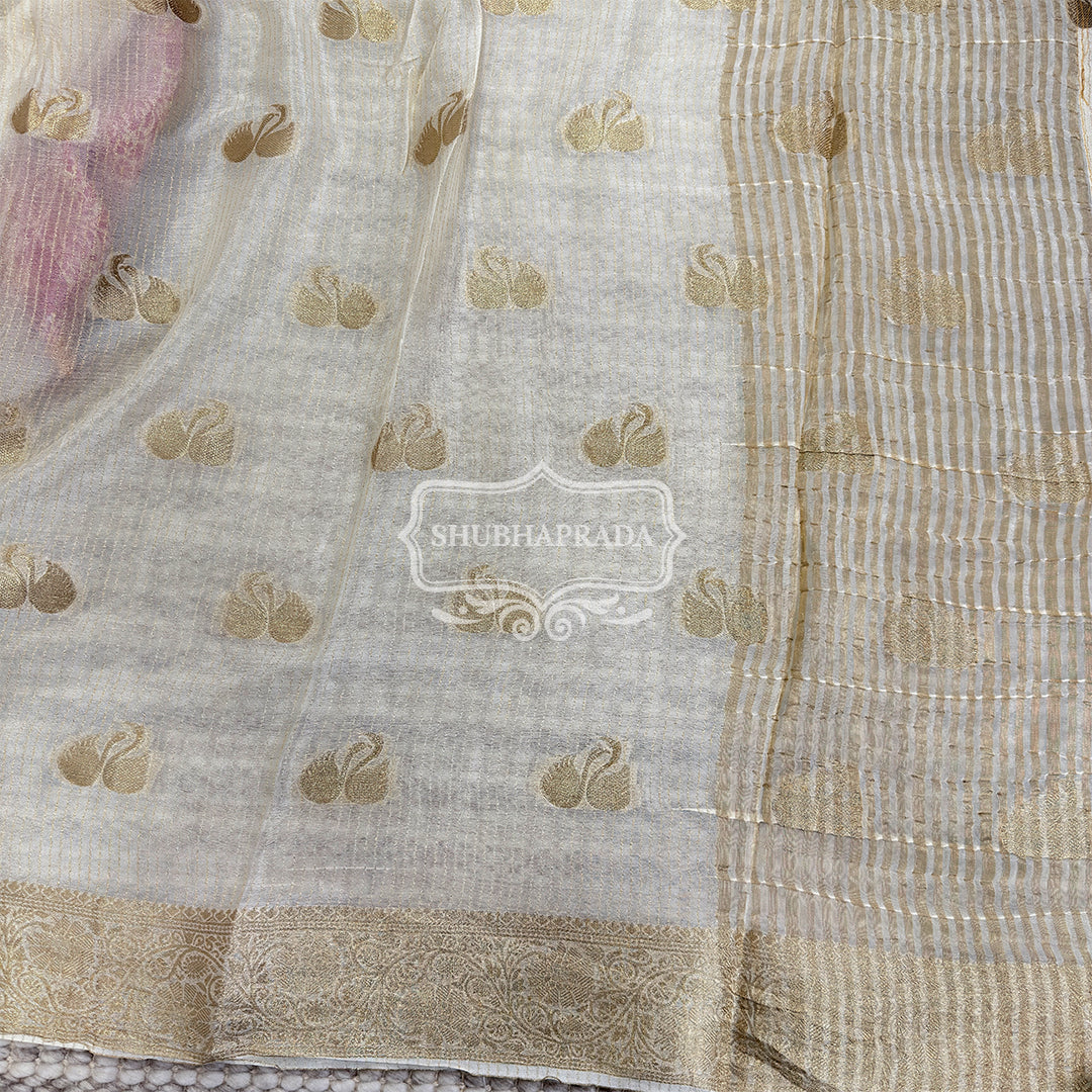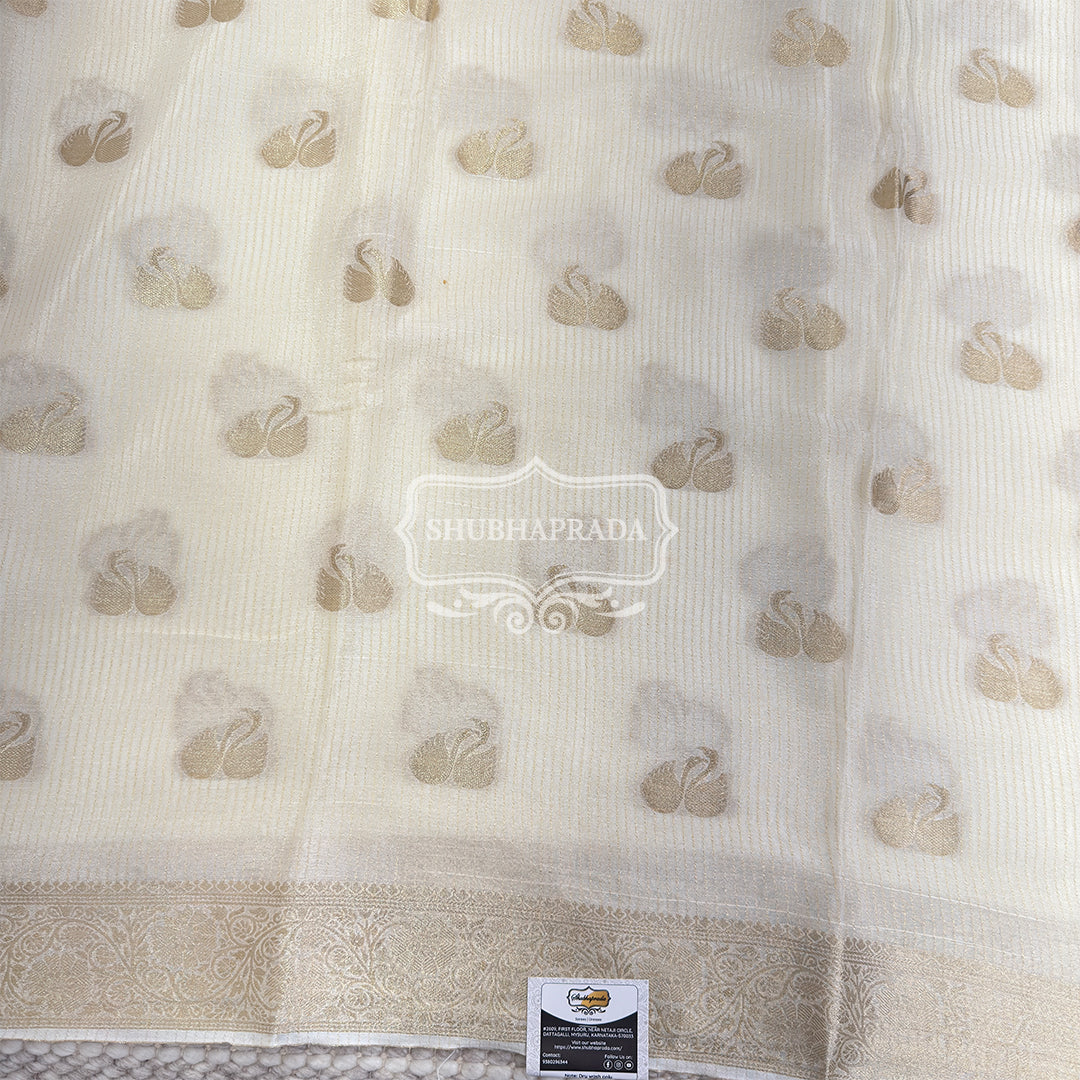 White Premium Chiffon Saree with Golden Swan Weaving Design